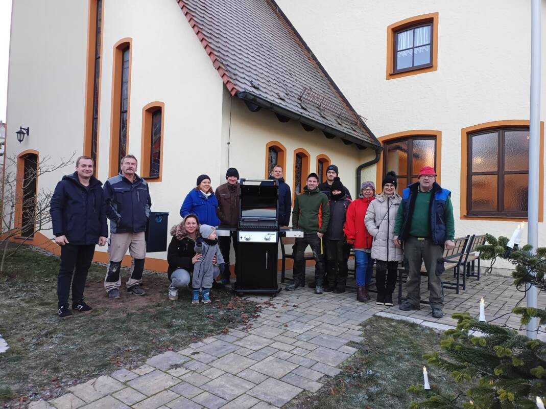 „Hier in Oberehrenbach ist ein gutes Miteinander“, stellt auch Pfarrer Michael Gehret fest und freut sich über das große Engagement seiner Kirchenmitglieder. „Und wir sind auch gerne beieinander“, fügt Georg Ott hinzu. Deshalb wurde auch ein Grill angeschafft, der hier aufgestellt wird. Die Idee für die Anschaffungen hatte Reinhard Kern. Er brachte auch alles auf den Weg. „Zum Glück ist es nicht so schwer so ein LEADER-Projekt zu beantragen“, erklärt Kern und erzählt, dass 70 Prozent der Anschaffungskosten übernommen wurden. Die Arbeiten für das Aufstellen des Grills, das Anbringen des Abfallkorbes oder das Einpflanzen des Baumes haben die Gemeindemitglieder dann selbst übernommen. „LEADER ist wichtig für Vereine, die engagiert sind“, stellt Georg Ott fest. Während der Adventszeit erstrahlt nun der kleine Baum vor der Kirche. „Ein gepflanzter Baum ist auf jeden Fall nachhaltiger und kann jedes Jahr geschmückt werden“, so Michael Gehret. Gepflegt wird er von Kirchenmitgliedern und Nachbarn. Im Sommer dann kann sich die ganze Gemeinde hier treffen und geschützt unter einem Zelt grillen und gemütlich beisammen sein. Das ist gelebte Dorfgemeinschaft.